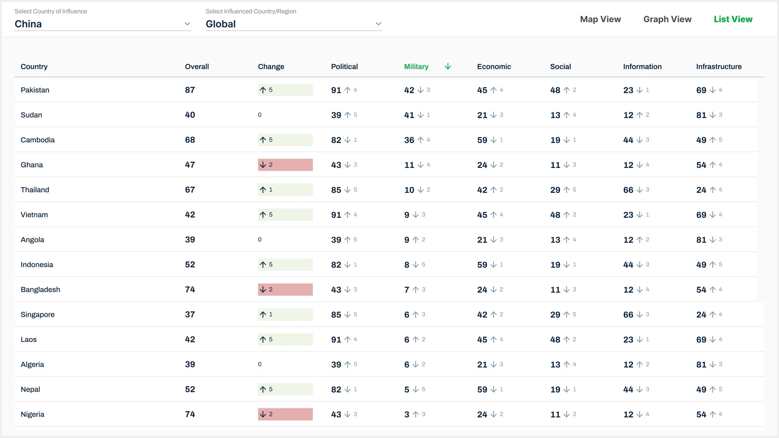User Flow 2: “You want to know which countries China has had a change in influence. Using the Data table, please find which countries China has had the most increase in Influence.”